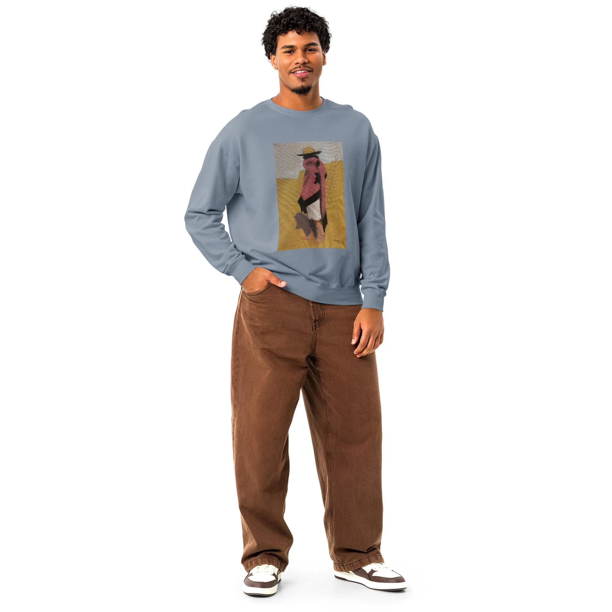 From Mark Kuykendall (of Wild Mountain Studios) as the great-grandson of Clinton Riggs, inventor of the Yield Right of Way sign seen around the world, this pale blue fleece sweatshirt showcases Clinton's first painting, completed in 1937.